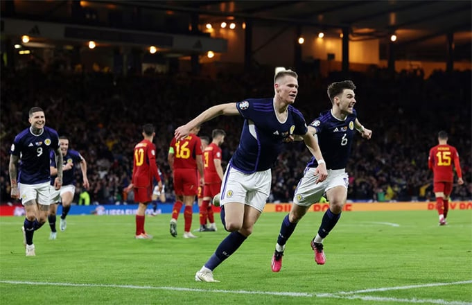সাত মিনিটে এন্ড্রু রবার্টসনের কাটব্যাকে ম্যাকটোমিনে গোল করে স্বাগতিকদের স্বপ্নের শুরু এনে দেন। রায়ান ক্রিস্টি ব্যবধান প্রায় দ্বিগুন করেই ফেলেছিলেন। অন্যদিকে নরওয়ের বিপক্ষে গত সপ্তাহে অভিষেকে দুই গোল করা জোসেলুর শট ক্রসবারে লাগলে সমতায় ফেরা হয়নি স্পেনের। প্রথমার্ধের স্টপেজ টাইমে লিন্ডন ডাকস স্কটল্যান্ডের ব্যবধান দ্বিগুন করার স্বুর্ণ সুযোগ হাতছাড়া করেন। তার শটটি বারের উপর দিয়ে বাইরে চলে যায়। দ্বিতীয়ার্ধ শুরুর ৬ মিনিটের মধ্যে ম্যাকটোমিনে আর কোন ভুল করেননি। কিয়েরান টিয়ারনির দারুন এক পাসে বাম পায়ের জোড়ালো ভলিতে ব্যবধান দ্বিগুন করেন ম্যাকটোমিনে। ম্যাচের শেষভাগে ফিরে আসার লড়াইয়ে কিছুটা চাপ সৃষ্টি করেছিল স্পেন। একের পর এক আক্রমণ করেও তারা গোলের দেখা পায়নি। আর এতেই গ্লাসগোতে ঘরের মাঠে স্কটল্যান্ডের ঐতিহাসিক জয় নিশ্চিত হয়। মরক্কোর কাছে পরাজিত হয়ে বিশ্বকাপের শেষ ষোল থেকে বিদায়ের পর স্পেনের কোচ লুইস এনরিকের স্থলাভিষিক্ত লুইস ডে লা ফুয়েন্তের জন্য এই পরাজয় সত্যিই ক্ষতিকর হলো। স্প্যানিশ মিডফিল্ডার রড্রি ম্যাচ শেষে বলেছেন, ‘এটা স্পষ্ট, যে দুটি সুযোগ তারা পেয়েছে তা শতভাগ কাজে লাগিয়েছে। আমরাও চেষ্টা করেছি। আমাদের দুটি শট পোস্টে লেগে ফেরত আসে। আমরাও অনেক সুযোগ তৈরী করেছি, বিশেষ করে প্রথমার্ধে আমাদের আধিপত্য ছিল বেশী। এই বিষয়গুলেতে আমাদের উন্নত করতে হবে। নাহলে এই ধরনের পরাজয় বারবার বরণ করতে হবে।’ কঠিন গ্রুপ হিসেবে বিবেচিত এ-গ্রুপে দুই ম্যাচে দুই জয়ে স্কটল্যান্ড ৬ পয়েন্ট নিয়ে শীর্ষে অবস্থান করছে। এই গ্রুপের আরো রয়েছে আর্লিং হালান্ডের নরওয়ে ও কাভিচা কাভারাটসখেইলার জর্জিয়া। দিনের আরেক ম্যাচে বাতুমিতে নরওয়ের সাথে ১-১ গোলে ড্র করেছে জর্জিয়া। আলেক্সান্দার সোরলোথের গোলে স্ক্যান্ডেনেভিয়ান্সরা ১৫ মিনিটে এগিয়ে গিয়েছিল। ইনজুরিতে থাকা হালান্ডের বদলী হিসেবে দলে সুযোগ পেয়েছেন সোরলোথ। ৬০ মিনিটে মেটজ ফরোয়ার্ড জর্জেস মিকাওটাজের গোলে জর্জিয়া এক পয়েন্ট নিয়ে মাঠ ছাড়ে। এর মাধ্যমে প্রথম ম্যাচ খেলতে নামা জর্জিয়া একটি বিষয় নিশ্চিত করেছে প্রথমবারের মত বড় কোন টুর্নামেন্টে খেলার স্বপ্ন নিয়ে মাঠে নামা দলটি অন্তত পরাজয় দিয়ে বাছাইপর্ব শুরু করতে চায়নি। নরওয়ের কোচ স্টালে সোলবাকেন বলেছেন, ‘আমরা যদি সুযোগ তৈরী করতে না পরাতাম ও তাদরেকে প্রতিরোধ করতে না পারতাম তবে ফলাফল আরো খারাপ হতে পারতো। আমরা বেশ কিছু দুর্দান্ত সুযোগ তৈরী করেছি, এটাই জীবন।’ বিশ্বকাপের সেমিফাইনালিস্ট ক্রোয়েশিয়া সহজেই তুরস্ককে ২-০ গোলে পরাজিত করেছে। ওয়েলসের সাথে ১-১ গোলের ড্র দিয়ে ত্রোয়েশিয়া তাদের বাছাইপর্ব মিশন শুরু করেছিল