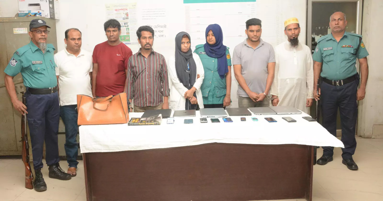 ডিএমপির মিডিয়া উইংয়ের উপ-কমিশনার ফারুক হোসেন জানান, অভিযানে ছয়টি ল্যাপটপ, ১০টি মোবাইল ফোন ও দুটি ব্যাগ জব্দ করা হয়েছে।