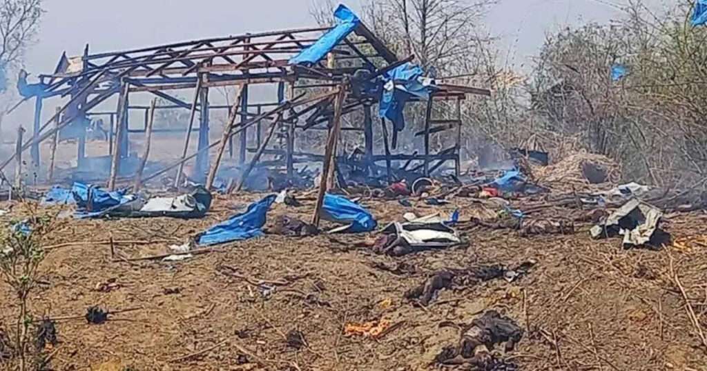 মিয়ানমারে বিরোধী গোষ্ঠীর একটি অনুষ্ঠানে বিমান হামলায় নিহতের সংখ্যা বেড়ে দাঁড়িয়েছে ১০০। দেশটির সামরিক জান্তা বাহিনী এ হামলা চালানোর কথা স্বীকার করেছে। আন্তর্জাতিক সংবাদমাধ্যম বিবিসি জানায়, স্থানীয় সময় গত মঙ্গলবার সকাল ৭টায় দেশটির সাগাইং অঞ্চলে একটি গ্রাম লক্ষ্য করে এ বিমান হামলা চালানো হয়। বুধবার (১২ এপ্রিল) স্থানীয় সংবাদমাধ্যম ইরাবতি নিউজকে সাগাইং অঞ্চলের সাবেক এম.এল.এ উ নে জিন লাট জানান, এ হামলায় শিশুসহ স্থানীয় অনেক অধিবাসী নিহত হয়েছে। প্রথমদিকে হতাহতের সংখ্যা ৫০ হলেও পরে এ সংখ্যা বাড়ে। একজন গ্রামবাসী জানান, বিদ্রোহী গোষ্ঠীর অনুষ্ঠানের সময় একটি সামরিক যুদ্ধবিমান সকাল ৭টায় উড়ে এসে অনুষ্ঠানস্থলে একটি বোমা ফেলে। পরে একটি হেলিকপ্টার গানশিপ ২০ মিনিটের মতো গ্রামটিতে বৃষ্টির মতো গুলিবর্ষণ করে। স্থানীয় বাসিন্দারা জানিয়েছেন, মরদেহগুলো এত ছিন্নবিচ্ছিন্ন হয়েছে যে, গণনা করা কঠিন হয়ে পড়ে।