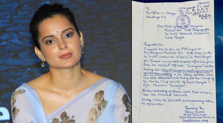 তৃণমূলের মুখপাত্র ঋজু দত্ত নামে এক ব্যক্তি পশ্চিমবঙ্গের উল্টোডাঙা থানায় এফআইআর দায়ের করেছেন। বাদির অভিযোগ, কঙ্গনার মতো একজন জনপ্রিয় তারকা যদি বাংলার পরিস্থিতি নিয়ে বিভ্রান্তিমূলক তথ্য ছড়ান, মুখ্যমন্ত্রীকে আক্রমণ করেন, তাহলে তার প্রভাব পড়বে জনমানসে। আর তা মোটেই কাম্য নয়। তাই এর সুবিচার চেয়ে থানার দ্বারস্থ হয়েছেন তিনি। ভারতীয় সংবাদমাধ্যম জানায়, তার অভিযোগ গৃহীত হয়েছে এবং সেই অনুযায়ী আইনি পদক্ষেপ নেবে পুলিশ।