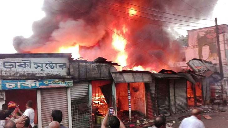 গোপালগঞ্জের কোটালীপাড়ায় ঘাঘর বাজারে আগুন লেগে ৮টি দোকান পুড়ে ছাই হয়ে গেছে। এতে প্রায় ৪ কোটি টাকার ক্ষতি হয়েছে বলে জানিয়েছেন ব্যবসায়ীরা। গত মঙ্গলবার দিবাগত রাত ১২টার দিকে এ ভয়াবহ অগ্নিকা- ঘটে। খবর পেয়ে স্থানীয় জনগণের সহযোগিতায় কোটালীপাড়া ফায়ার সার্ভিস প্রায় ৩ ঘণ্টা চেষ্টা চালিয়ে আগুন নিয়ন্ত্রণে আনে। এসময় জননী ফার্মেসি, ত্রিনাথ বস্ত্রালয়, অনুপম বস্ত্রালয়, সাহা সু স্টোর, খন্দকার বুক হাউজ, সুমাইয়া গার্মেন্টস, ফ্যাশন পয়েন্ট ও ফ্রেন্ডস কম্পিউটারের দোকান পুড়ে ছাই হয়ে যায়। জননী ফার্মেসির মালিক পুলক সাহা বলেন, গত মঙ্গলবার রাত ৯টার দিকে দোকান বন্ধ করে বাড়ি যাওয়ার পর রাত সাড়ে ১২টার দিকে খবর পাই বাজারে আগুনে লেগেছে। বাড়ি থেকে বাজারে এসে দেখি ব্যবসা প্রতিষ্ঠানটি সম্পূর্ণ পুড়ে ছাই হয়ে গেছে। দোকানে প্রায় ৭০ থেকে ৮০ লাখ টাকার ওষুধ ছিলো। ঘাঘর বাজার ব্যবসায়ী সমিতির সাধারণ সম্পাদক মোস্তফা কামাল বলেন, আগুন লাগার ঘটনায় প্রায় ৪ কোটি টাকার ক্ষতি হয়েছে। বেশিরভাগ ব্যবসায়ী ব্যাংক ঋণ নিয়ে ব্যবসা করছেন। তাদের ক্ষতির পরিমাণ আরও বেশি। উপজেলা ফায়ার স্টেশনের ইনচার্জ নজরুল ইসলাম বলেন, খবর পাওয়ার পরপরই ঘটনাস্থলে গিয়ে প্রায় ৩ ঘণ্টা চেষ্টা চালিয়ে আগুন নিয়ন্ত্রণে আনা হয়েছে। বৈদ্যুতিক গোলযোগের কারণে সাহা সু স্টোর থেকে আগুনের সূত্রপাত বলে প্রাথমিকভাবে ধারণা করা হচ্ছে।