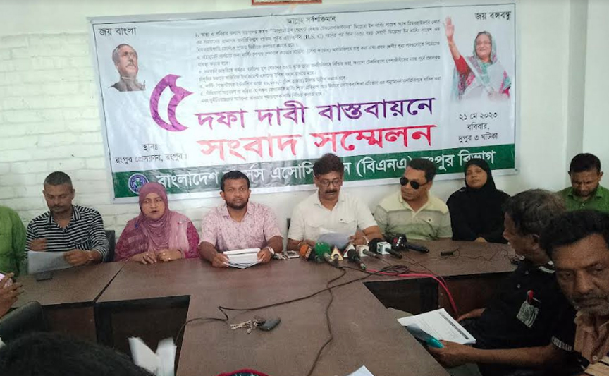 সরকারী চাকুরীতে নার্সেদের মূল বেতনের সাথে ৩০ ভাগ ঝুকি ভাতা অবিলম্বে নিশ্চিত করার দাবী জানান। এছাড়ার নার্সিং ইন্টানশিপ ভাতা ২০ হাজার টাকায় উন্নিত করা এবং বেসরকারী ভাবে গড়ে উঠা সকল নাসিং প্রতিষ্টান বন্ধের দাবী জানান সংবাদ সম্মেলনে।