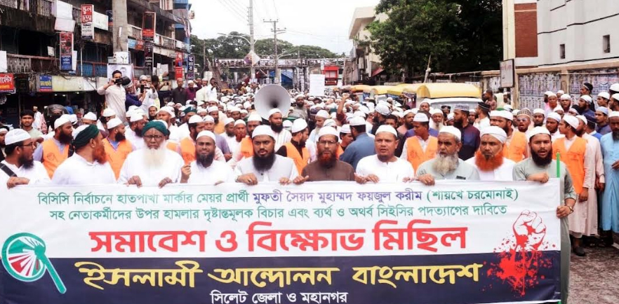 বরিশাল সিটি কর্পোরেশন নির্বাচনে হাতপাখা মার্কার মেয়র প্রার্থী ও দলের নায়েবে আমির মুফতি সৈয়দ মুহাম্মদ ফয়জুল করিম (শায়খে চরমোনাই) সহ নেতাকর্মীদের উপর হামলার দৃষ্টান্তমূলক বিচার, ব্যর্থ ও অথর্ব সিইসির পদত্যাগের দাবিতে ইসলামী আন্দোলন বাংলাদেশ সিলেট জেলা ও মহানগর শাখার উদ্যোগে বিক্ষোভ মিছিল ও সমাবেশ অনুষ্ঠিত হয়েছে।