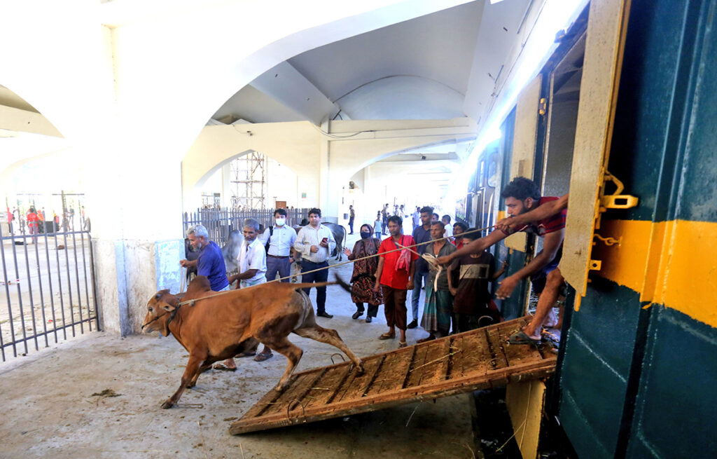 ঈদুল আযহা উপলক্ষে কোরবানীর জন্য রাজশাহী থেকে গরুর স্পেশাল ট্রেনে গরু নিয়ে আসে ব্যবসায়ীরা। ছবিটি রোববার কমলাপুর রেলস্টেশন থেকে তোলা।