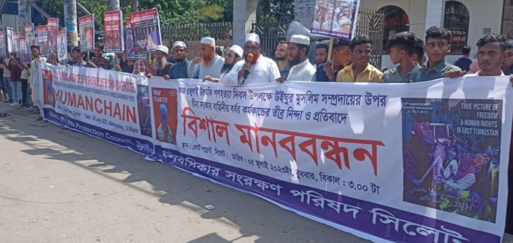 বুধবার (৫ জুলাই) উইঘর মুসলিমদের গনহত্যা (উইকমিরি ম্যসাকার) দিবস উপলক্ষে মানবাধিকার সংরক্ষণ পরিষদ সিলেট এর ব্যানারে নগরীর কোর্ট পয়েন্টে এই মানববন্ধন কর্মসূচি পালন করা হয়।