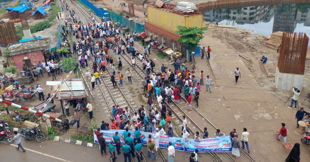রবিবার (১৬ জুলাই) সকালে রাজধানীর কারওয়ানবাজারের এফডিসি রেলগেট এলাকায় ‘বাংলাদেশ রেলওয়ে অস্থায়ী শ্রমিকবৃন্দ’ ব্যানারে তিতাস কমিউটার ট্রেন আটকে এই অবরোধ কর্মসূচি পালন করছেন তারা।