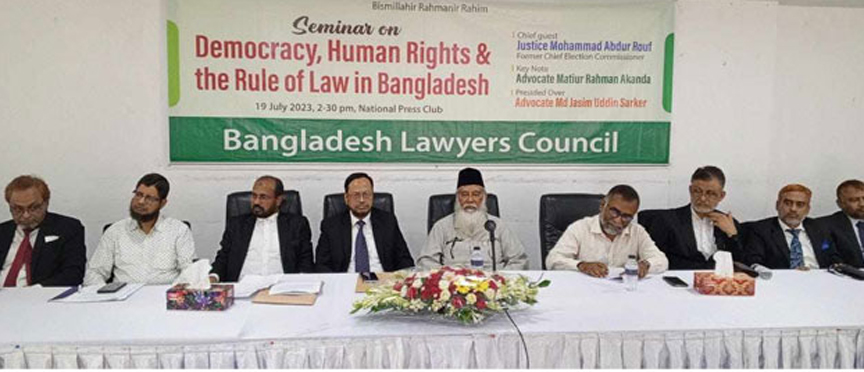 বাংলাদেশ লইয়ার্স কাউন্সিলের উদ্যোগে ১৯ জুলাই ২০২৩ ইং বুধবার দুপুর ০২-০০ টায় জাতীয় প্রেসক্লাবের আব্দুস সালাম মিলনায়তনে “ডেমোক্রেসি, হিউম্যান রাইটস এন্ড দ্য রুল অব ল ইন বাংলাদেশ” শীর্ষক এক সেমিনার অনুষ্ঠিত হয়েছে।