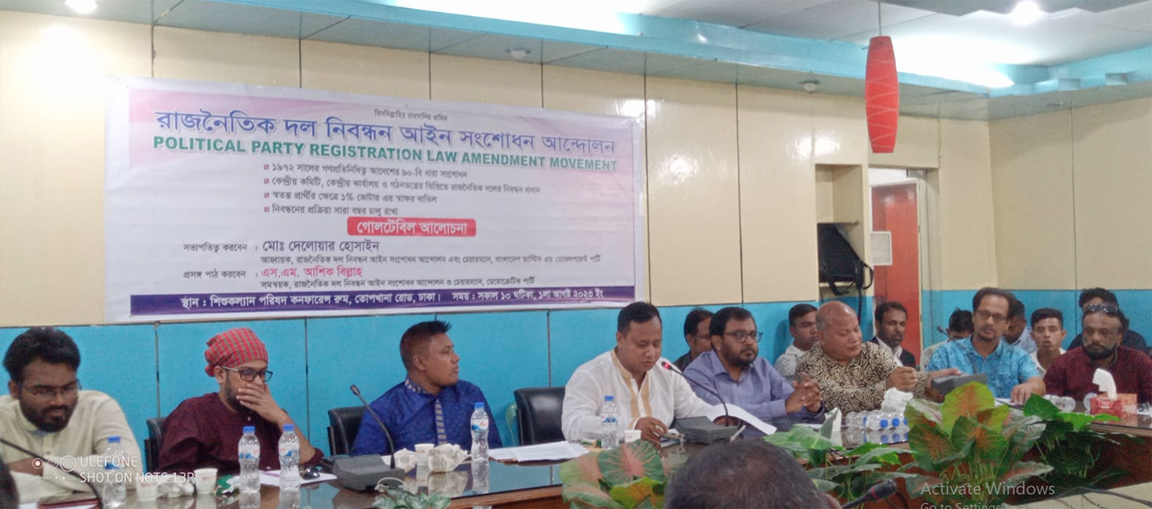 ১৯৭২ সালের গণপ্রতিনিধিত্ব আদেশের ৯০-বি ধারা সংশোধন করে কেন্দ্রীয় কমিটি, কেন্দ্রীয় কার্যালয় ও গঠনতন্ত্রের ভিত্তিতে নতুন রাজনৈতিক দলের নিবন্ধন প্রদান ও নিবন্ধনের প্রক্রিয়া সারা বছর চালু রাখার দাবীতে মঙ্গলবার সকাল ১০টায় রাজনৈতিক দল নিবন্ধন আইন সংশোধন আন্দোলনের উদ্যোগে  একটি গোলটেবিল আলোচনা অনুষ্ঠিত হয়। আলোচনা সভায় সভাপতিত্ব করেছেন সংগঠনের আহ্বায়ক এবং বাংলাদেশ জাস্টিস এন্ড ডেভেলপমেন্ট পার্টির চেয়ারম্যান মোঃ দেলোয়ার হোসাইন, একটি প্রেস বিজ্ঞপ্তির মাধ্যমে জানা যায়।