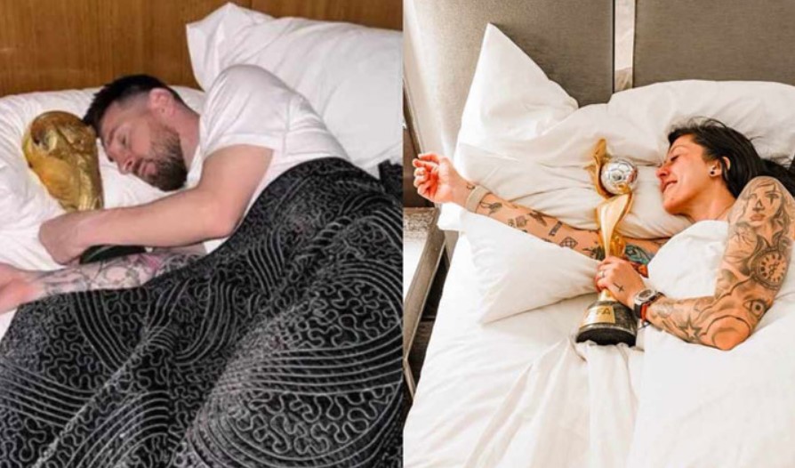 ডানদিকে কাত হয়ে শুয়ে আছেন জেনি হারমোসো। ডান হাতের ওপর সদ্য জেতা বিশ্বকাপ ট্রফি শুয়ে রেখে বাঁ হাত দিয়ে ধরে আছেন। ছবিটি তিনি টুইটারে শেয়ার করার পর থেকে আলোচনায় লিওনেল মেসি। কারণ গত বছর ডিসেম্বরে আর্জেন্টিনাকে বিশ্বকাপ জেতানোর পর বিছানায় ট্রফি নিয়ে এই পোজে ছবি তুলে পোস্ট করেন সাতবারের ব্যালন ডি’অর জয়ী। মেসিকে অনুকরণ করেই এই ছবি তুলেছেন কি না হারমোসো, তা জানাননি। তবে বুঝিয়ে দিয়েছেন, ঘুমের মধ্যেও ট্রফিটা হাতছাড়া করতে চান না তিনি।