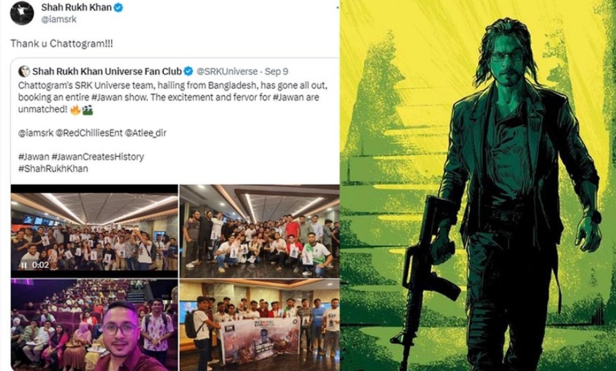 চট্টগ্রামের ভক্তদের ধন্যবাদ জানালেন শাহরুখ খান। শাহরুখ খান ইউনিভার্স ফ্যান ক্লাব চট্টগ্রাম ভক্তদের উন্মাদনার কয়েকটি ছবি পোস্ট করে। পোস্ট করে ভিডিও। সেখানে ভক্তরা শাহরুখ শাহরুখ বলে চিৎকার করতে থাকে। ‘এসআরকে ইউনিভার্স বাংলাদেশ’ ফ্যান ক্লাব থেকে সিনেমা হল ভাড়া করে ‘জাওয়ান’ দেখেছেন অনুরাগীরা। তারই অংশ হিসেবে সম্প্রতি চট্টগ্রামে তারা বিশেষ শোয়ের আয়োজন করেন। সেসবেরই কিছু স্থিরচিত্র সামাজিক মাধ্যমে প্রকাশ করে শাহরুখ খান ইউনিভার্স ফ্যান ক্লাব। টুইটারে প্রকাশিত পোস্টটি রিটুইট করে শাহরুখ খান লিখেছেন- থ্যাংক ইউ চট্টগ্রাম। জানা গেছে, চট্টগ্রামের শাহরুখ ভক্তরা একাধিকবার সিনেমাটি দেখেছে। হাতে শাহরুখ খানের পোস্টার নিয়ে র্যালিও করেছেন তারা।