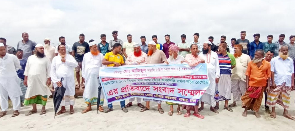 মঙ্গলবার দুপুরে সাভার উপজেলার বনগাঁও ইউনিয়নের কোন্ডা এলাকায় এই সংবাদ সম্মেলন ও মানববন্ধন করা হয়। সংবাদ সম্মেলনে জমির মালিকরা বলেন, ভূমিদস্যু মোঃ আজিজুল সন্ত্রাসী বাহিনী দিয়ে গত দের বছর যাবত জোরপূর্বক অবৈধ ভাবে বৈধ কাগজ পত্র থাকা সত্যেও আমাদের নিজেদের জমিতে বালু ভরাট করে সন্ত্রাসী রাজত্ব কায়েম করেছে। কোন্ডা মৌজায় আমাদের প্রায় ১০০’শ বিঘা জমি জোর পূর্বক দখল করে রেখেছে ভূমিদস্যু মোঃ আজিজুল এর নেতৃত্বে এলাকার মনির হোসেন (বর্তমান মেম্বার), আওলাদ হোসেন মোল্লা, মনির হোসেন (নৌকা মনির), আলাউদ্দিন মেম্বার (সাবেক), রমজান, বাহার উদ্দিন, আব্দুল গণি, সালাউদ্দিন, গিয়াস উদ্দিন, আল-ইসলাম, মাসুদসহ আরো অনেকে।