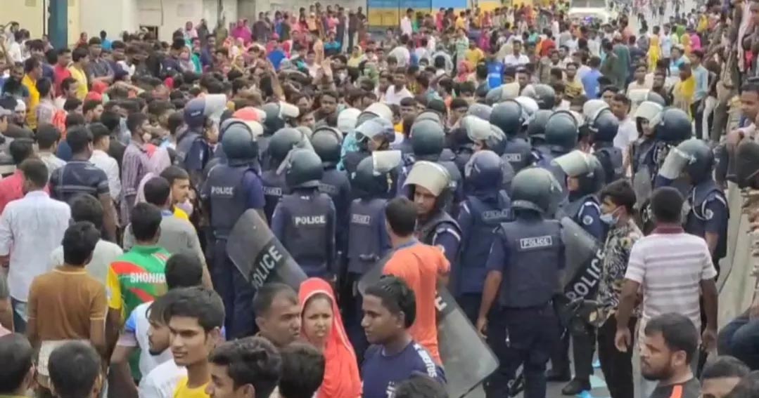 শ্রমিকরা পুলিশকে লক্ষ্য করে ইট-পাটকেল নিক্ষেপ করে।
