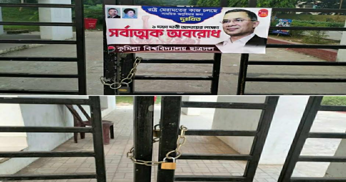 রবিবার (৫ নভেম্বর) সকাল সাড়ে ৬টার দিকে কুমিল্লা বিশ্ববিদ্যালয় শাখা ছাত্রদলের সদস্য সচিব মোস্তাফিজুর রহমান শুভসহ ছাত্রদলের আরও কয়েকজন মিলে বিশ্ববিদ্যালয়ের প্রধান ফটকে তালা ঝুলিয়ে দেন। এ সময় একটি ব্যানারও টানিয়ে দেওয়া হয়।