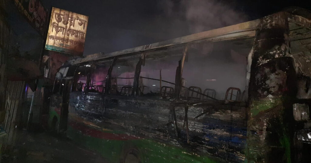 ফায়ার সার্ভিস ও সিভিল ডিফেন্সের মিডিয়া সেলের স্টেশন অফিসার তালহা বিন জসিম জানান, সোমবার (১৩ নভেম্বর) সন্ধ্যা ৬টা ১৬ মিনিটে চৌরাস্তা ব্রিজের কাছে মৌমিতা পরিবহনের একটি বাস থামিয়ে আগুন ধরিয়ে দেয় দুর্বৃত্তরা।