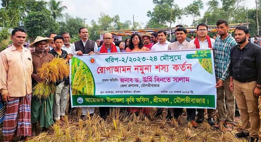 মৌলভীবাজারের শ্রীমঙ্গলে খরিপ-২/২০২৩-২৪ মৌসুমে ব্লক প্রদর্শনী স্থাপনের মাধ্যমে রোপা আমন ধানের সময়ে চাষাবাদ (Synchronize Cultivation) এর নিমিত্ত কৃষি প্রণোদনা কর্মসূচির আওতায় কম্বাইন্ড হার্ভেস্টার যন্ত্রের সাহায্যে শস্য কর্তন শুভ উদ্বোধন করা হয়েছে।