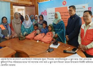 ক্ষুধা, শিশুশ্রম, বাল্যবিবাহমুক্ত ও স্কুল ঝড়ে পড়া রোধকল্পে ঝুঁকিপূর্ণ শিশু পরিবারের মাঝে শর্ত সাপেক্ষে নগদ অর্থ ও স্কুল ব্যাগ বিতরণ