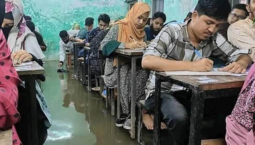পানিতে ভাসছে টেবিল, বেঞ্চ ও জুতা। পরনের জামাকাপড় ভিজছে। হাঁটুপানিতে বসে আছেন পরীক্ষার্থীরা। এই পানিতে হেঁটেই শিক্ষকরা এনে দিলেন পরীক্ষার খাতা ও প্রশ্নপত্র। শিক্ষার্থীদের হাতে চলতে শুরু করে কলম। এটি কোনও নদী বা সাগর...
