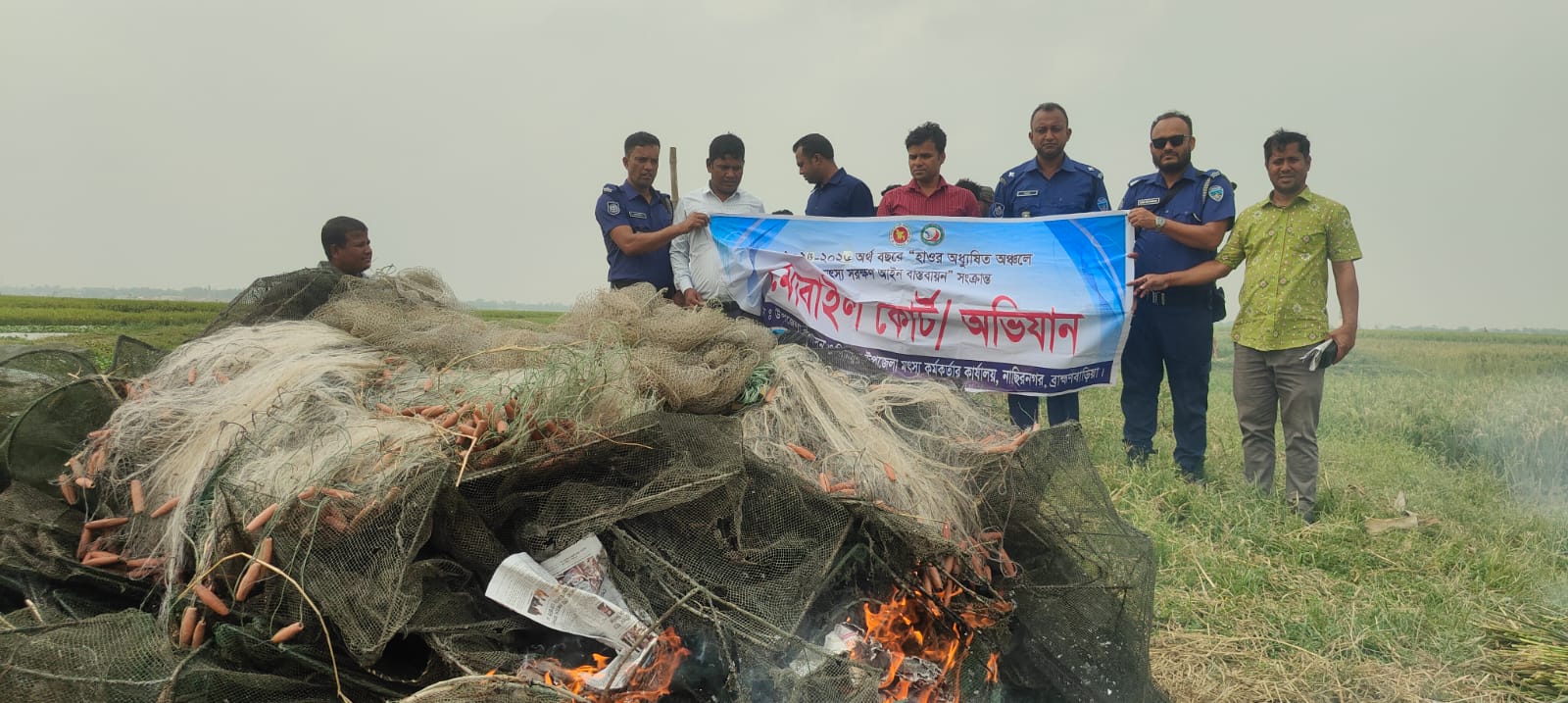 নাসিরনগরে সাড়ে ৩ লাখ টাকার কারেন্ট ও রিং জাল পুড়িয়ে ধ্বংস
