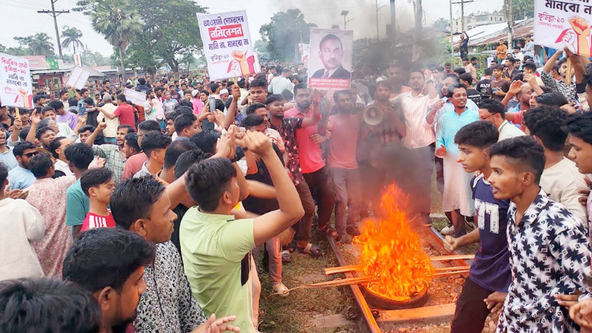 নাঙ্গলকোটে বিএনপির মনোনয়ন না পেয়ে রেলপথে টায়ার জ্বালিয়ে বিক্ষোভ