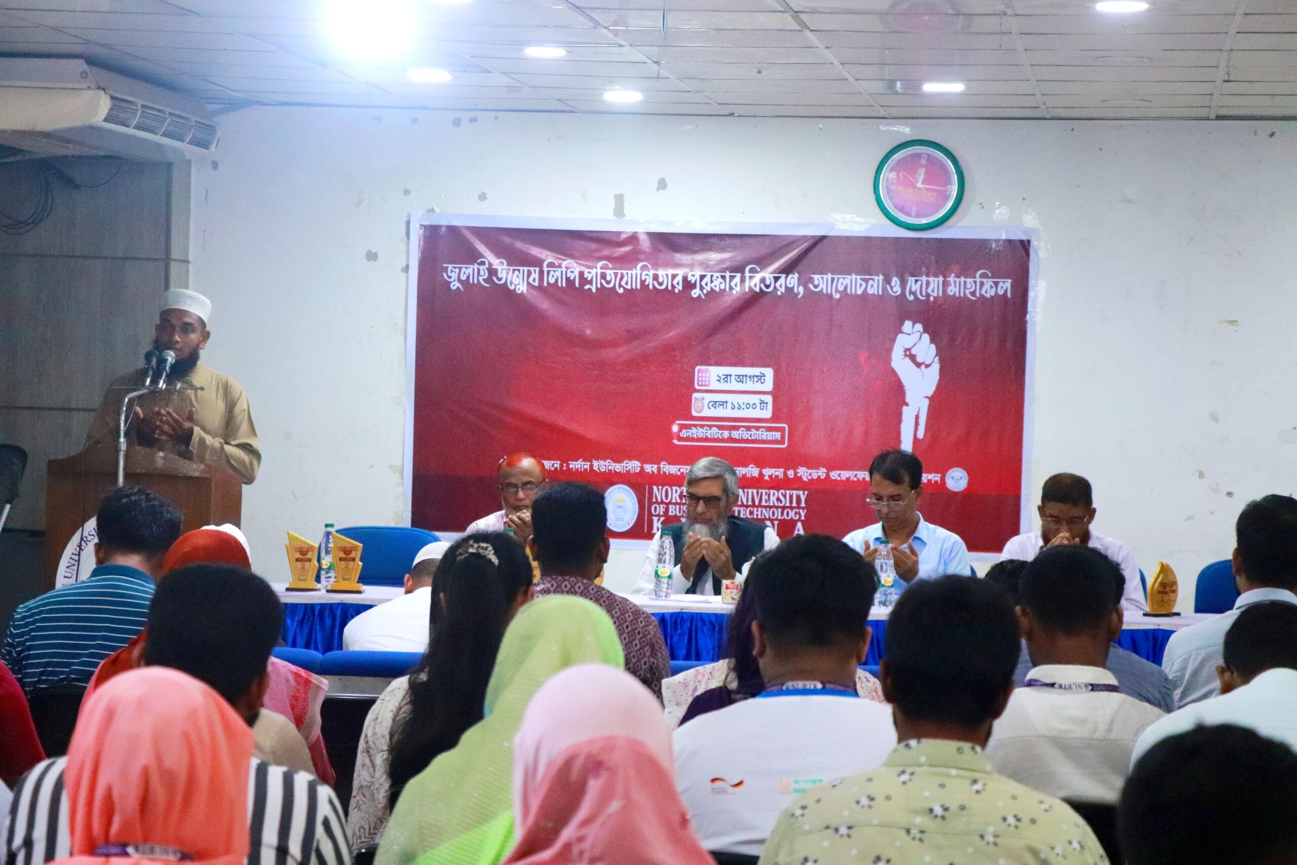 নর্দান ইউনিভার্সিটি বিজনেস অ্যান্ড টেকনোলজি খুলনা (এনইউবিটিকে) এবং স্টুডেন্ট ওয়েলফেয়ার অ্যাসোসিয়েশন কতৃক যৌথ ভাবে জুলাই উম্মেষ লিপি প্রতিযোগিতার পুরস্কার বিতরণী,আলোচনা সভা ও দোয়া মাহফিলের অনুষ্ঠিত হয়।। শনিবার এনইউবিটি সকাল  খুলনার  শিববাড়ি’স্থ অস্থায়ী ক্যাম্পাসের অডিটোরিয়ামে  ...