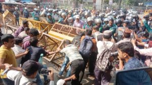 পুলিশের ব্যারিকেড ভেঙে শিক্ষকদের শাহবাগ অবরোধ, যান চলাচল বন্ধ