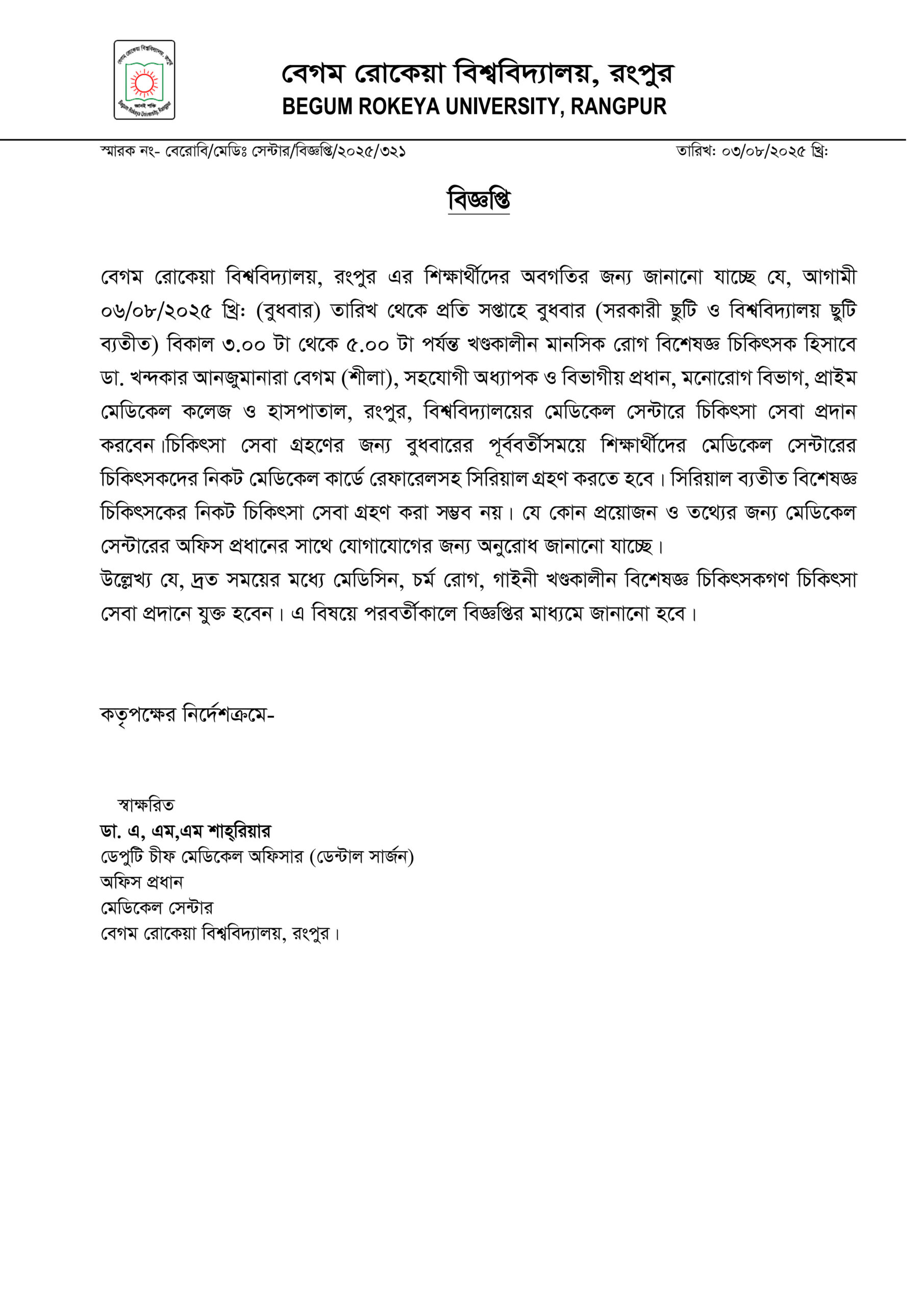 বেরোবি প্রতিনিধি প্রতি বুধবার মানসিক রোগ বিশেষজ্ঞ চিকিৎসকের সেবা পাবেন রংপুরের বেগম রোকেয়া বিশ্ববিদ্যালয় (বেরোবি) শিক্ষার্থীরা। রোববার (০৩ আগস্ট) বিকেলে জনসংযোগ, তথ্য ও প্রকাশনা দপ্তর থেকে পাঠানো এক বিজ্ঞপ্তিতে তথ্য জানানো হয়। বিজ্ঞপ্তিতে...