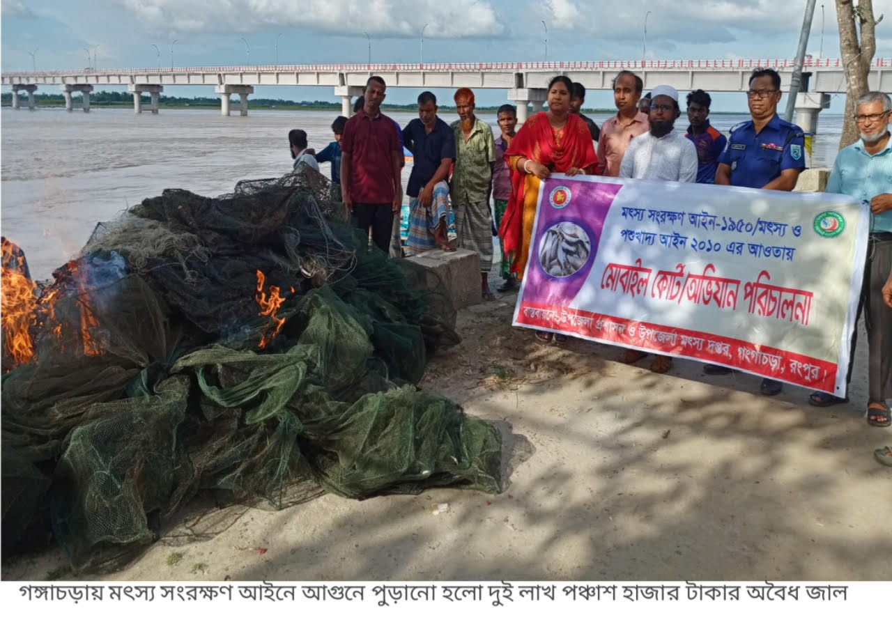 গঙ্গাচড়ায় মৎস্য সংরক্ষণ আইনে আগুনে পুড়ানো হলো দুই লাখ পঞ্চাশ হাজার টাকার অবৈধ জাল